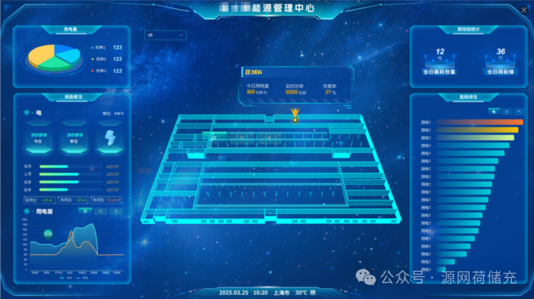 電能計量表計安裝在主要配電節點、重點用能設備等處,綜合能源管理平臺實時采集用電數據,對用電數據進行逐時、逐日、逐月分析,并結合國家、行業標準,統計企業整體碳排放,為碳中和提供基礎數據服務。企業用能總量數據和強度數據可上傳至政府監管平臺,滿足政府碳排放監管要求。